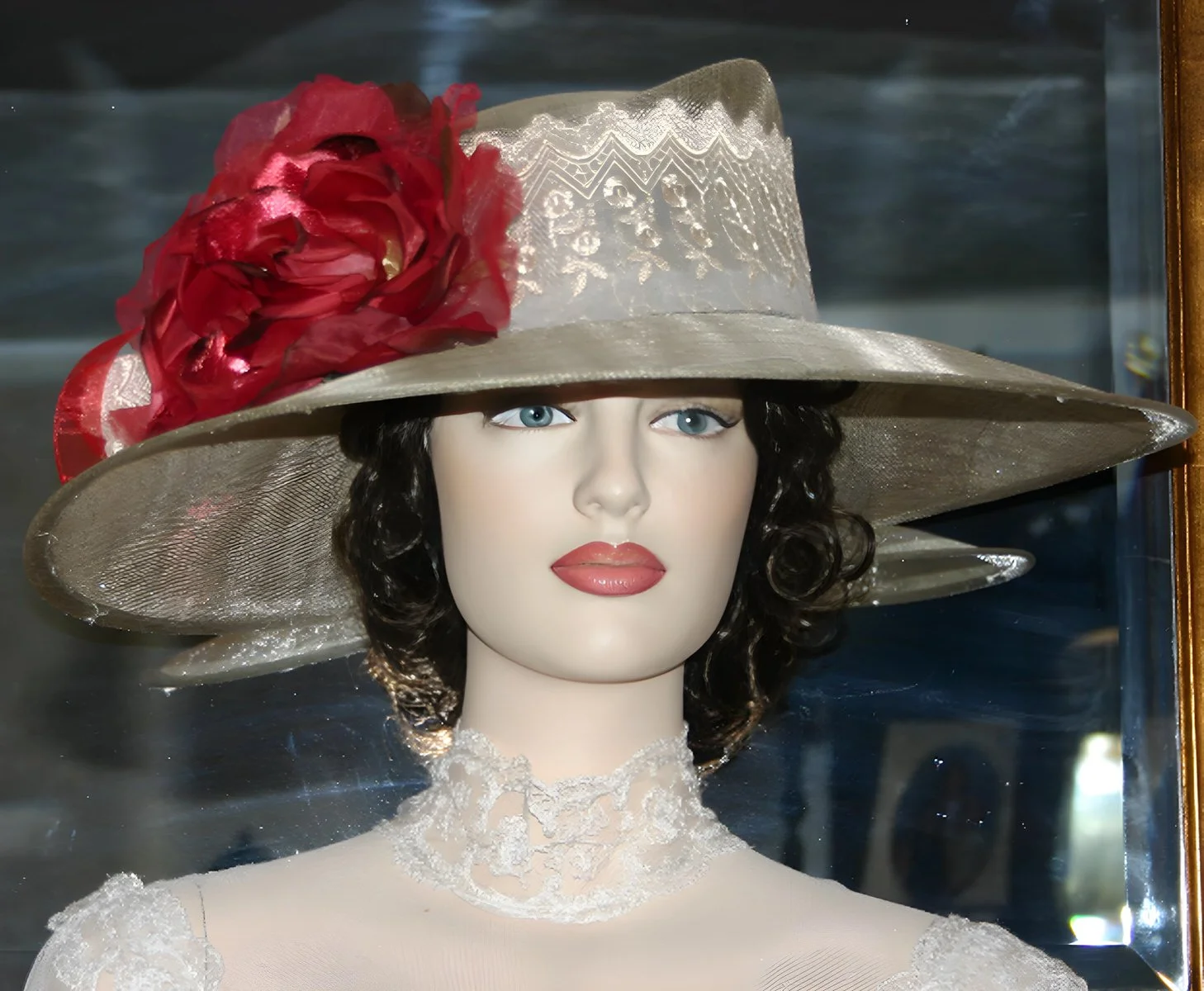Wide Brim Taupe Kentucky Derby Hat trimmed with tea stained Organza embroidered lace and Red Organza Roses.